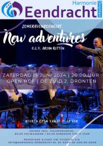 Kom naar het concert van de Harmonie Eendracht Dronten op zaterdag 15 juni! Het thema is ‘Nieuwe Avonturen’ en Arjan Rutten zal dirigeren. Waar: Open Hof, de Zuid 2 in Dronten. We starten om 20.00 uur en de deuren gaan open om 19.30 uur. Toegangsprijs is 9.50 euro voor volwassenen en 5 euro voor kinderen tot en met 12 jaar, inclusief een pauzedrankje.